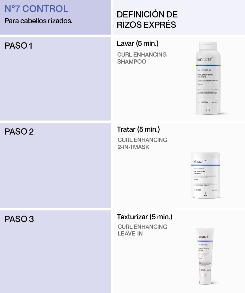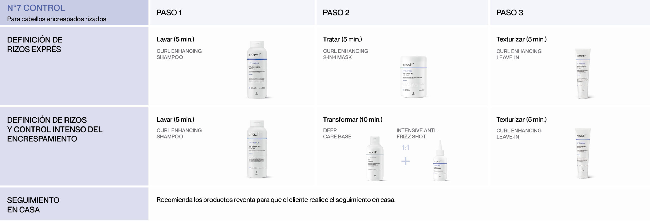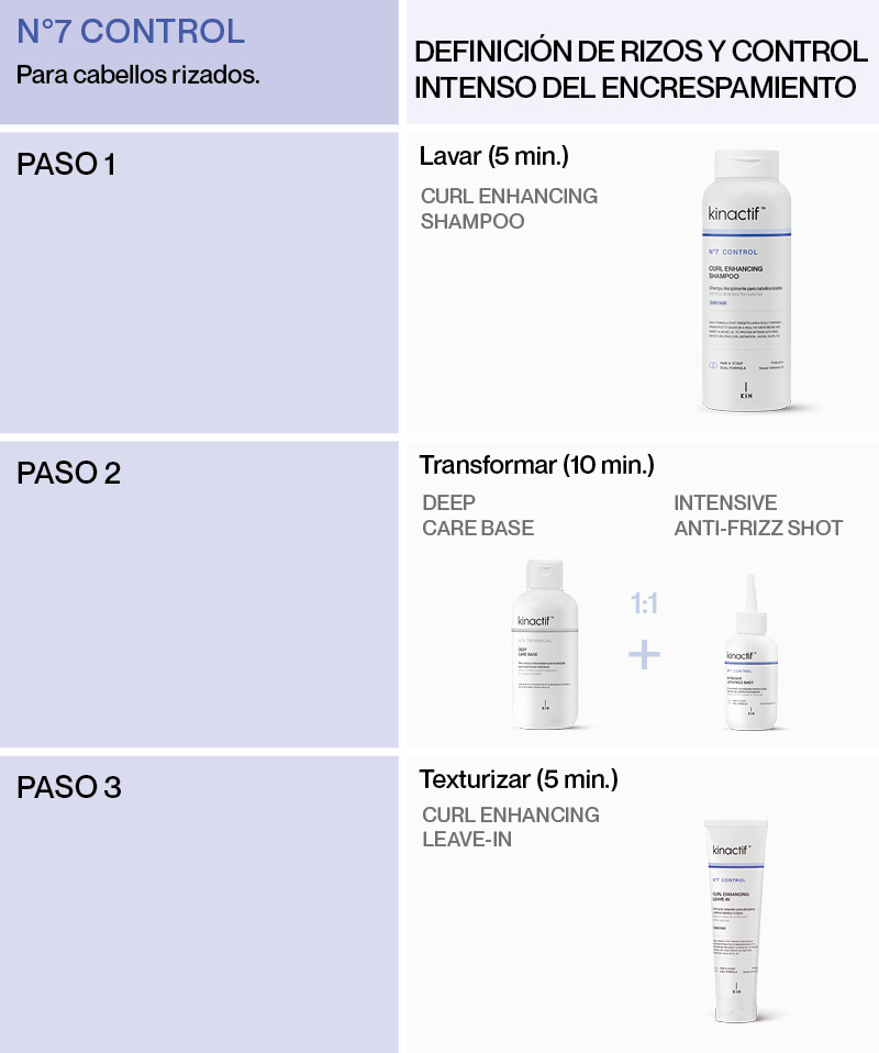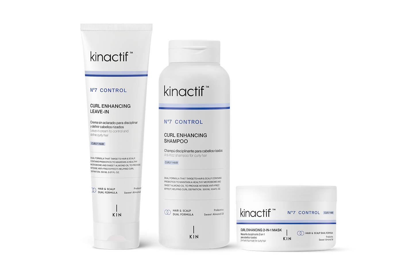 KINACTIF™ N°7 CONTROL combate el encrespamiento en cabellos rizados encrespados. Sus fórmulas contienen ingredientes que ayudan a controlar el encrespamiento, dejando el cabello definido, brillante y suave.